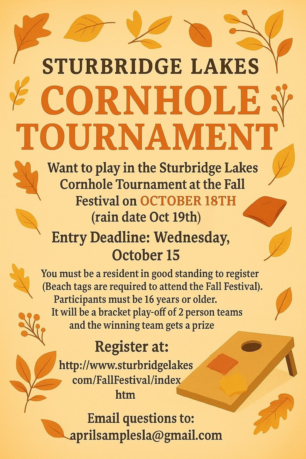 Want to play in the Sturbridge Lakes Cornhole Tournament at the Fall Festival on OCTOBER 18TH (rain date oct 19th)??? Festival is from 12:00-2:00.