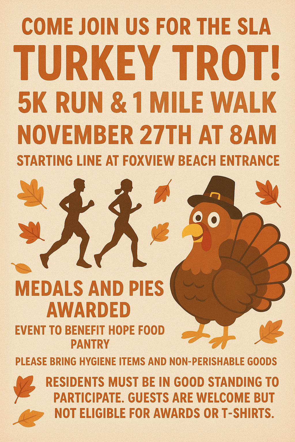 Click here to register Sturbridge Lakes Turkey Trot 2025 for the 5K Turkey Trot or 1 Mile. Deadline Friday, November 21st, 2025. No late registration